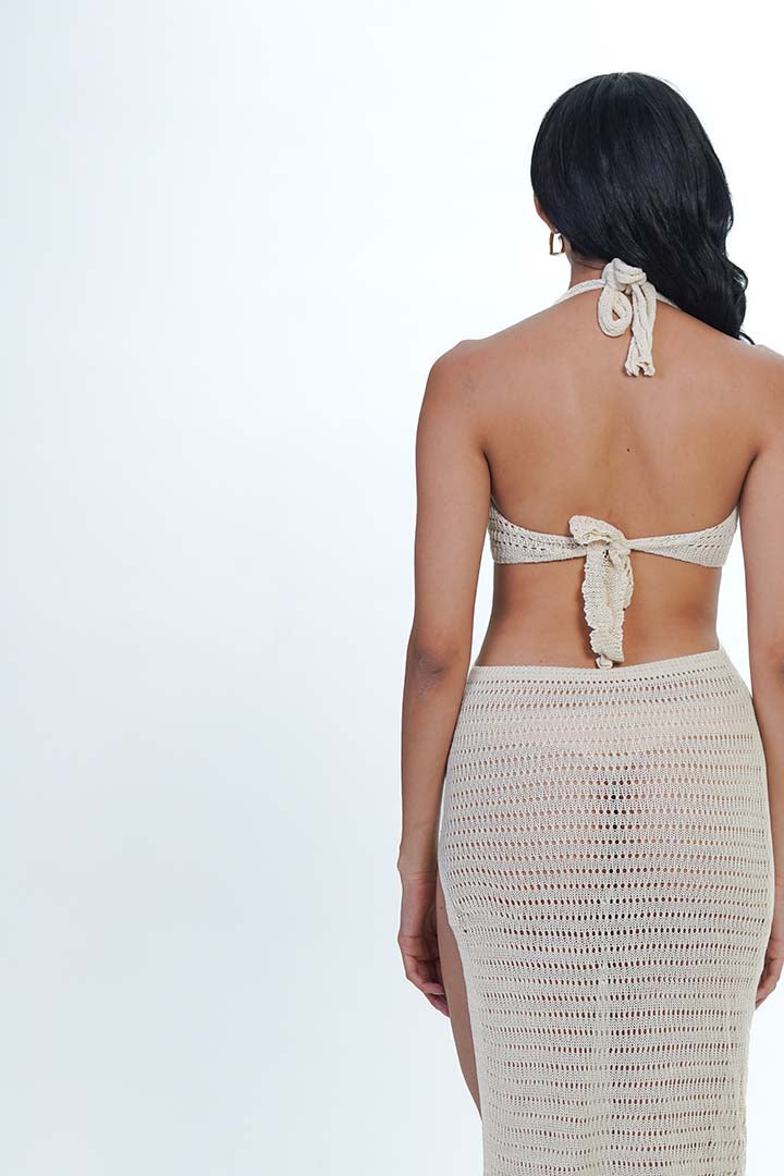 A breezy and bold choice for beachside lounging or resort escapes. This one-piece knit cover-up features a flattering halter neckline and a body-hugging silhouette, connected by a central ring detail that adds flair and structure.