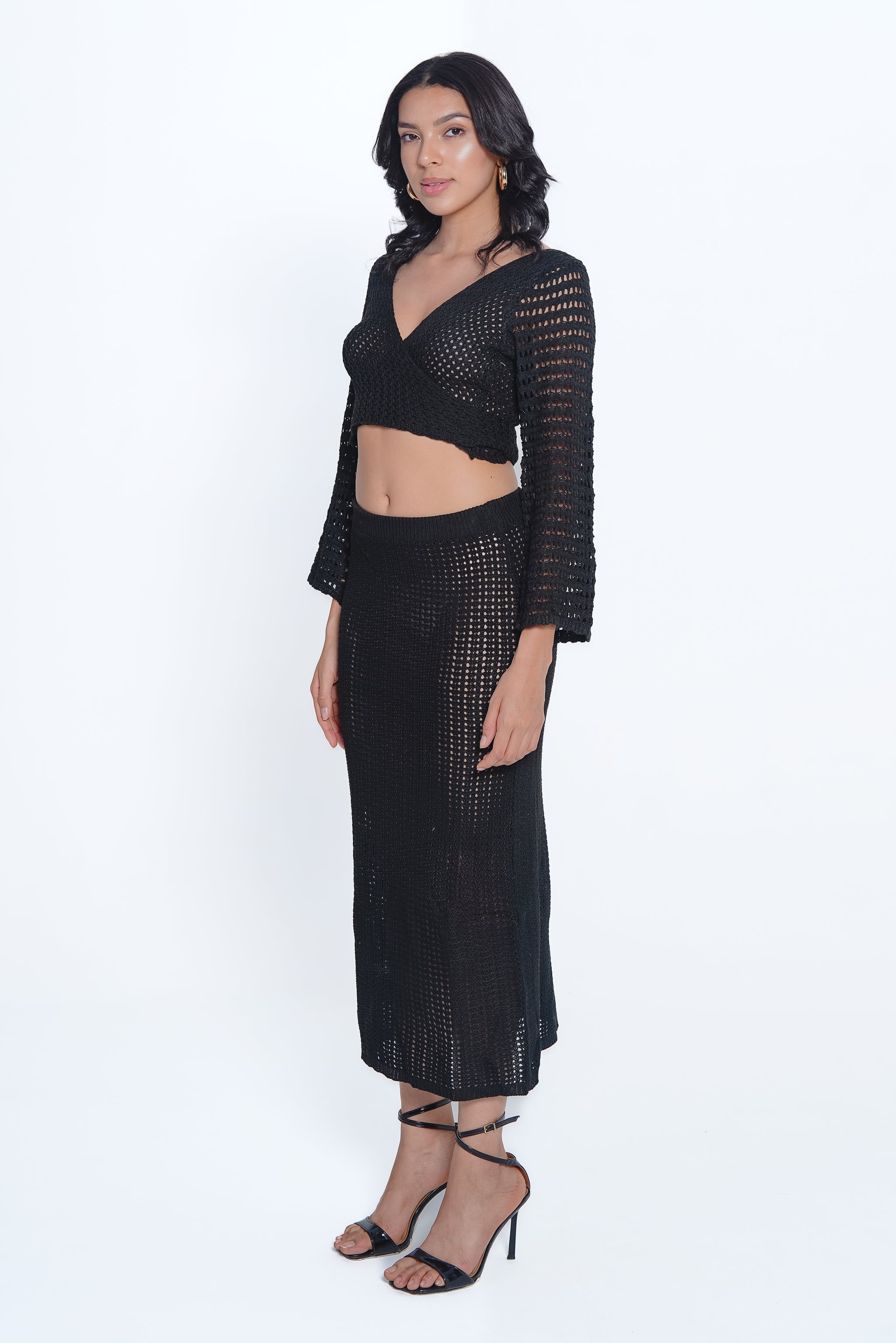 Paired with a matching high-waist skirt, the open-knit texture offers breathable comfort while creating a bold yet elegant sheer effect. The skirt’s form-skimming silhouette is balanced by its airy movement, making it the perfect companion piece for swimwear or styled as a statement co-ord on its own.