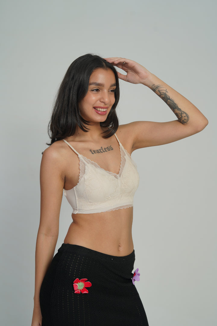 This Savvyy bralette bra is designed to merge femininity with effortless style. Featuring soft satin-finish cups paired with intricate floral lace panels, it strikes the perfect balance between coverage and allure. The sheer lace extends below the bust with a scalloped hemline, adding a romantic charm that elevates this piece beyond the everyday.