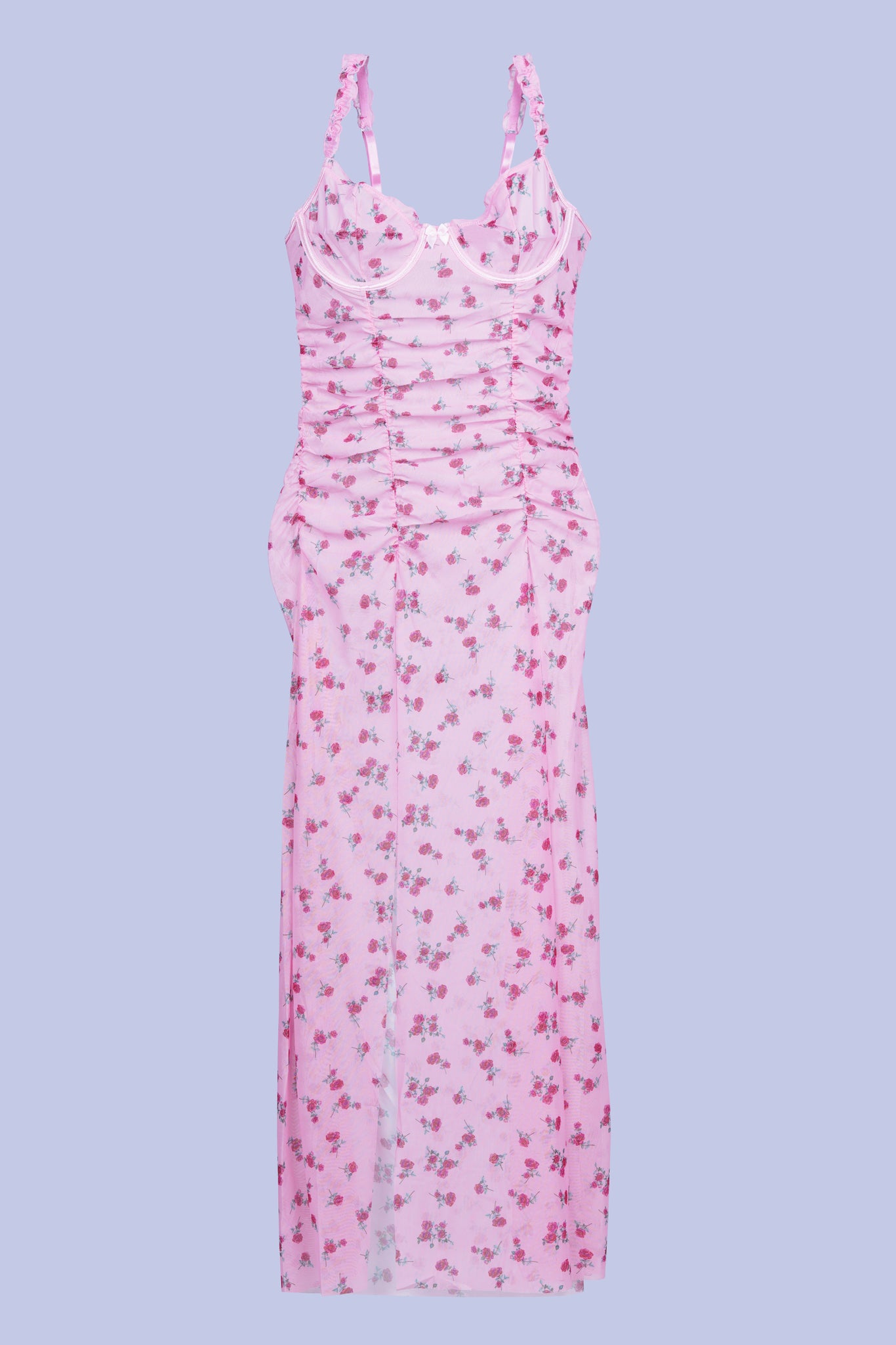 AXTZH Elegant Floral Slit Long Nightwear Dress for Women X2924-PINPR-F2N