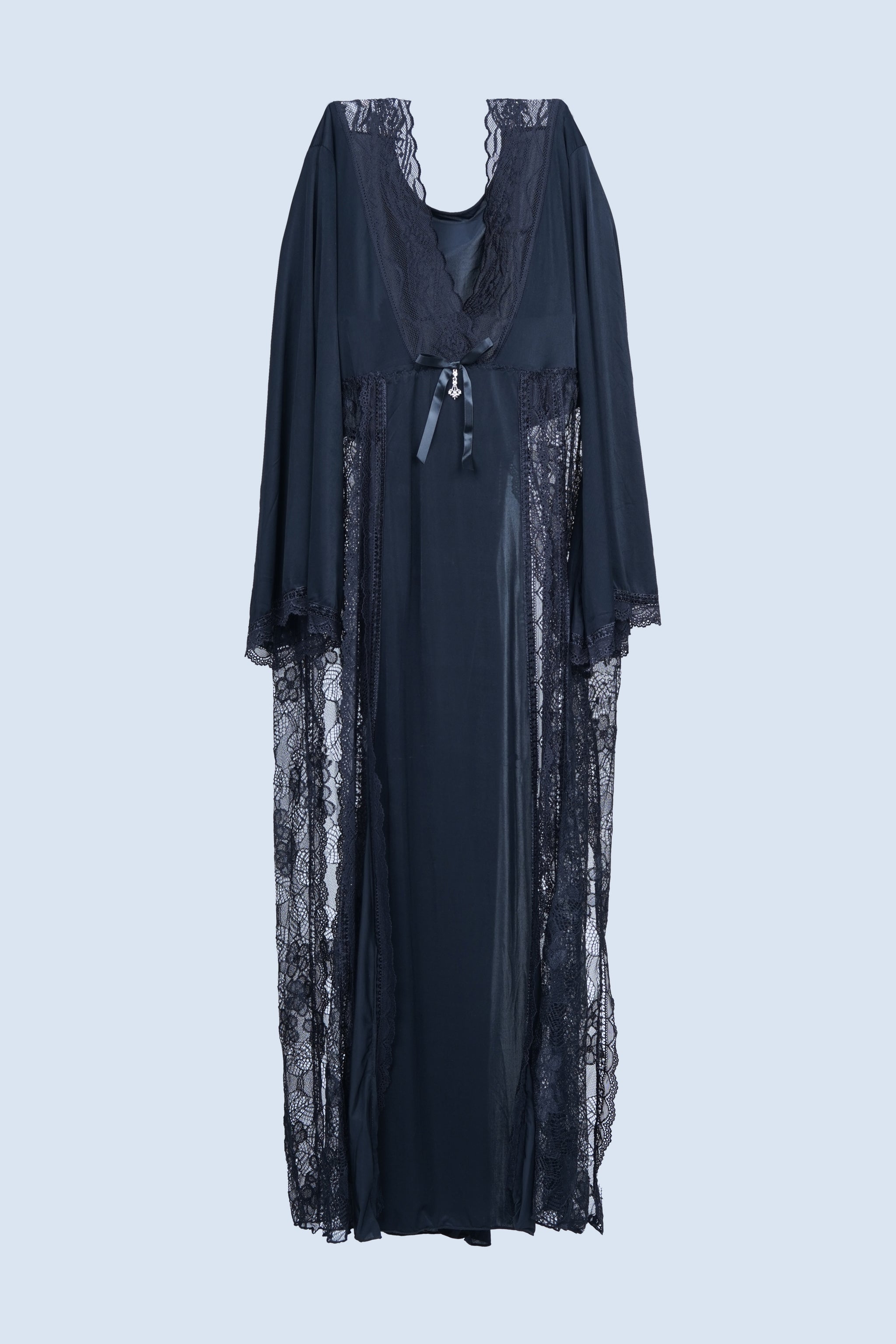 introduces a two-piece nightwear set designed for women who love elegance with a sensual touch. This set includes a flowing sheer robe paired with a matching inner slip that beautifully complements the look. The robe features lace-trimmed edges and wide sleeves, giving it a graceful fall and a romantic appeal.