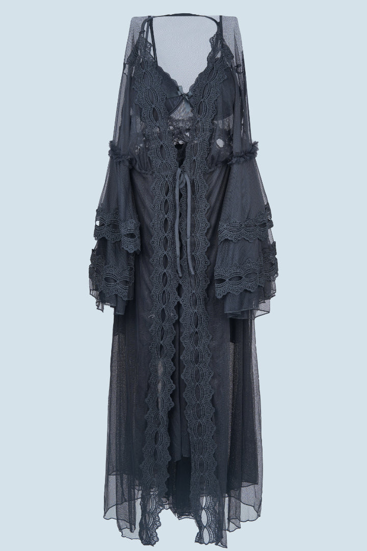 Sheer robe with elegant lace detailing and flared sleeves