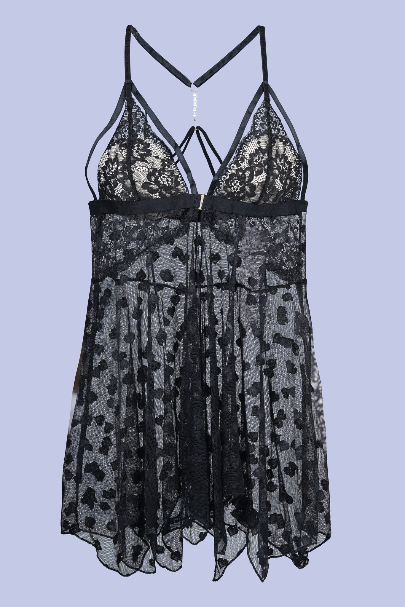 The piece features an intricately designed front with delicate lace patterns and mesh detailing that add sophistication while enhancing feminine charm. The deep neckline, paired with slender adjustable straps, ensures a comfortable and personalized fit. Its flowing, airy design allows effortless movement, making it perfect for romantic evenings or cozy nights in.