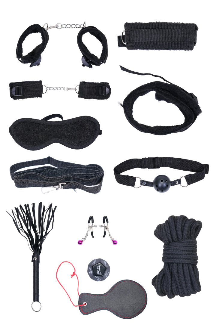 • Complete 11-piece set: bodysuit with cuffs, mask, rope, gag, whip, clips, paddle, and more