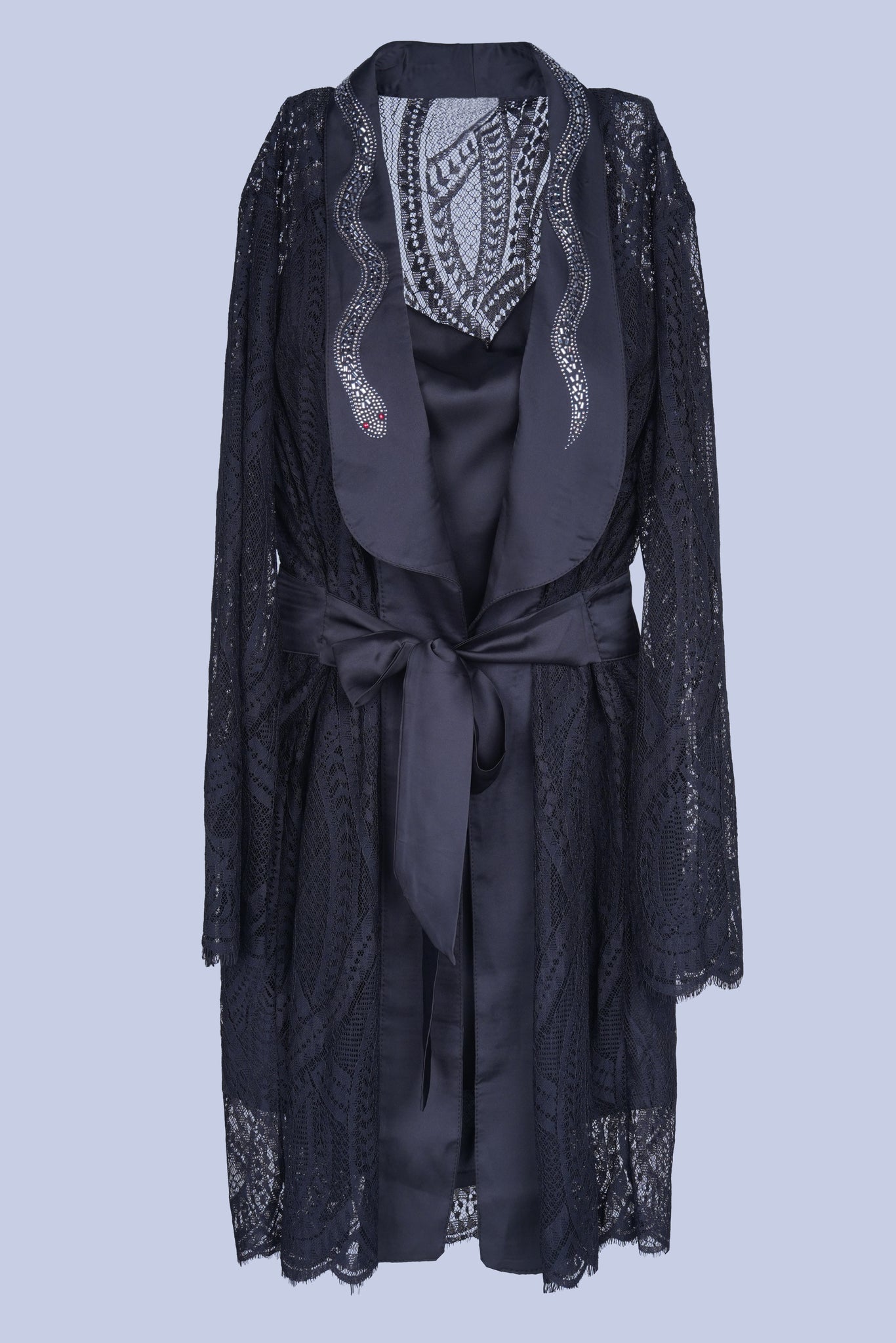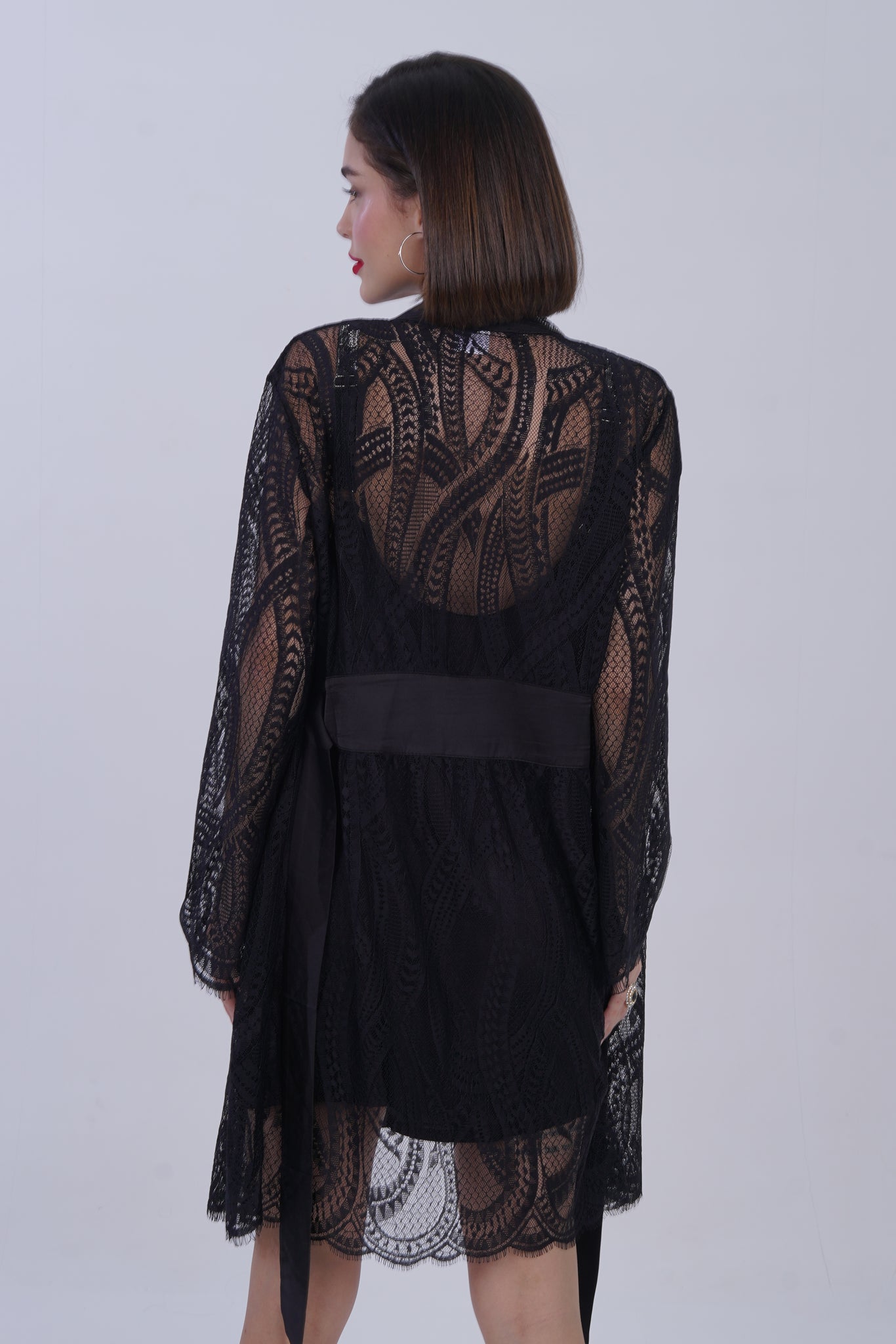 The inner slip is tailored with a flattering neckline and a lightweight finish that feels soft against the skin, making it ideal for relaxed lounging or a restful night’s sleep. Complementing it is the sheer lace robe, finished with a tie-up waist belt that allows you to style it effortlessly — whether worn open for a more relaxed look or cinched at the waist for a defined silhouette.