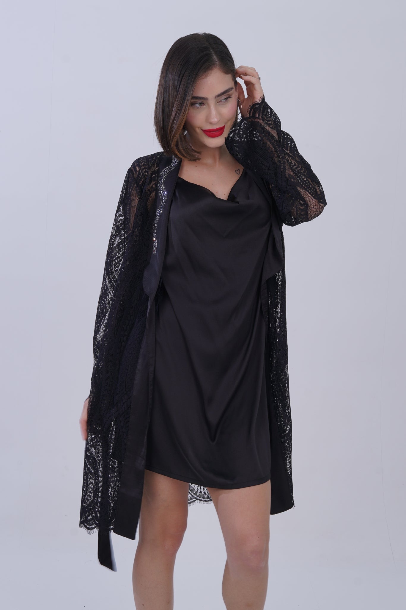 AXTZH Stylish Nightwear Set for Women with Delicate Inner Dress and Matching Lace Cover-Up X0115-BLACK-F11S