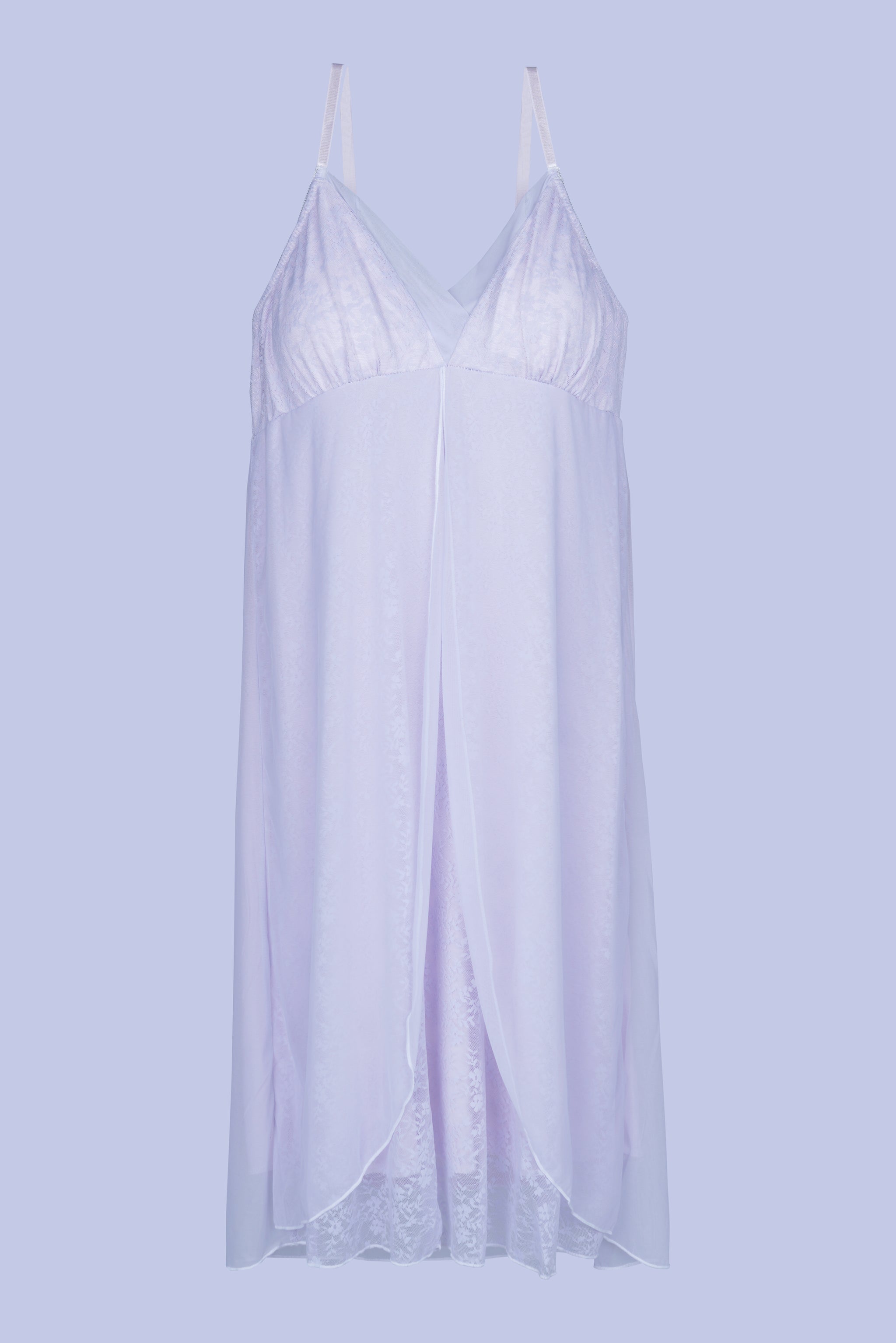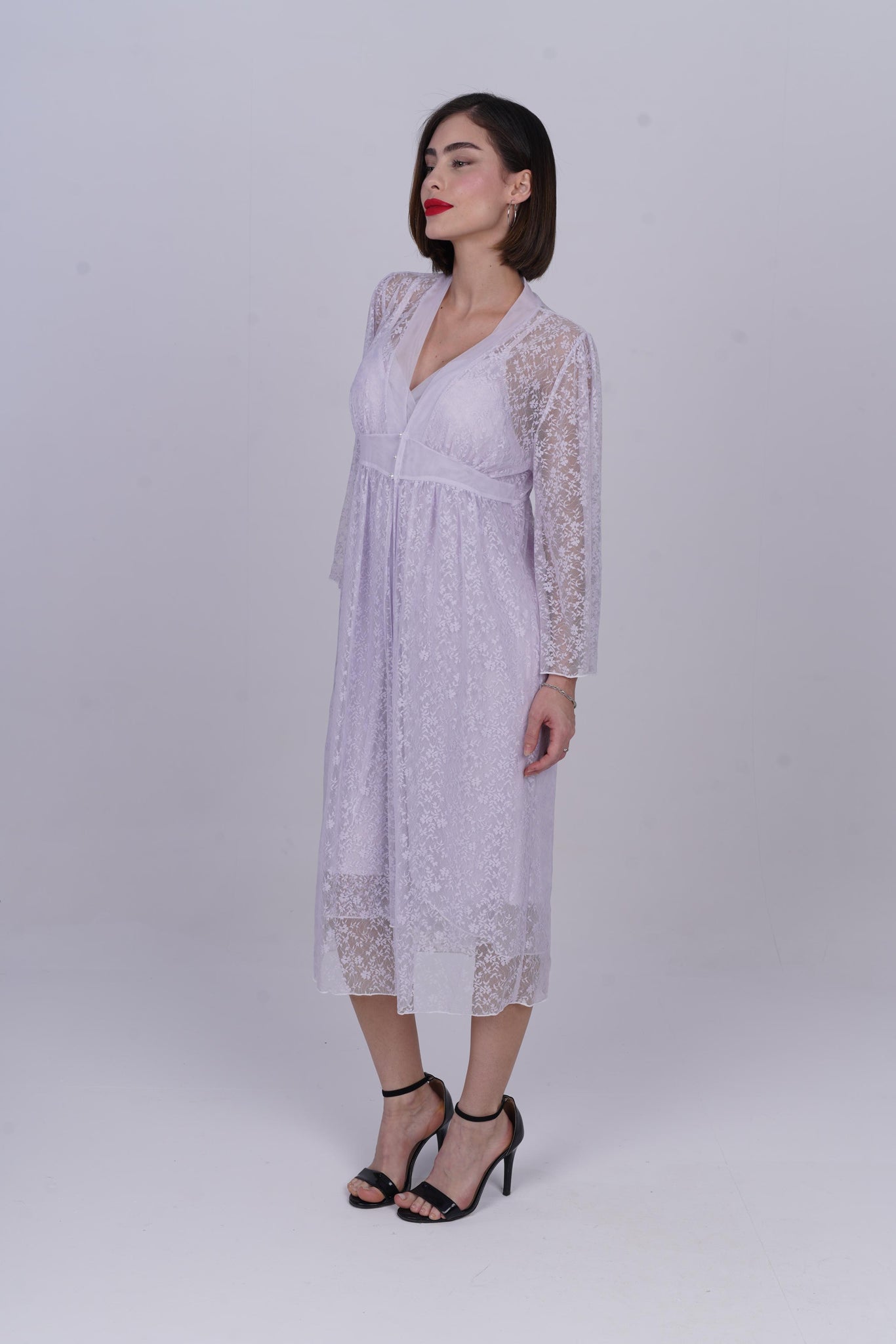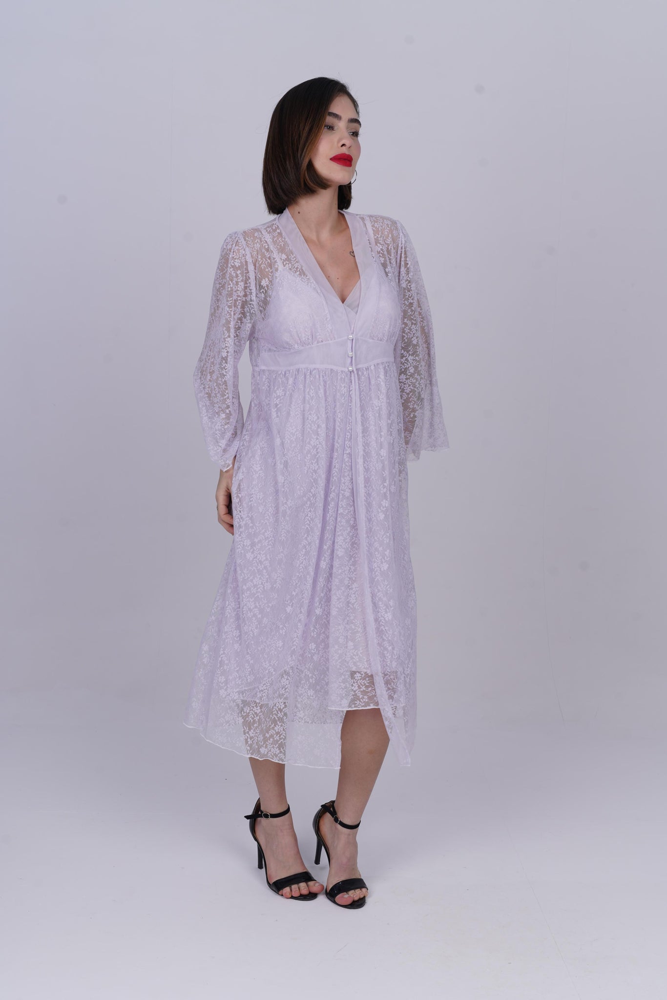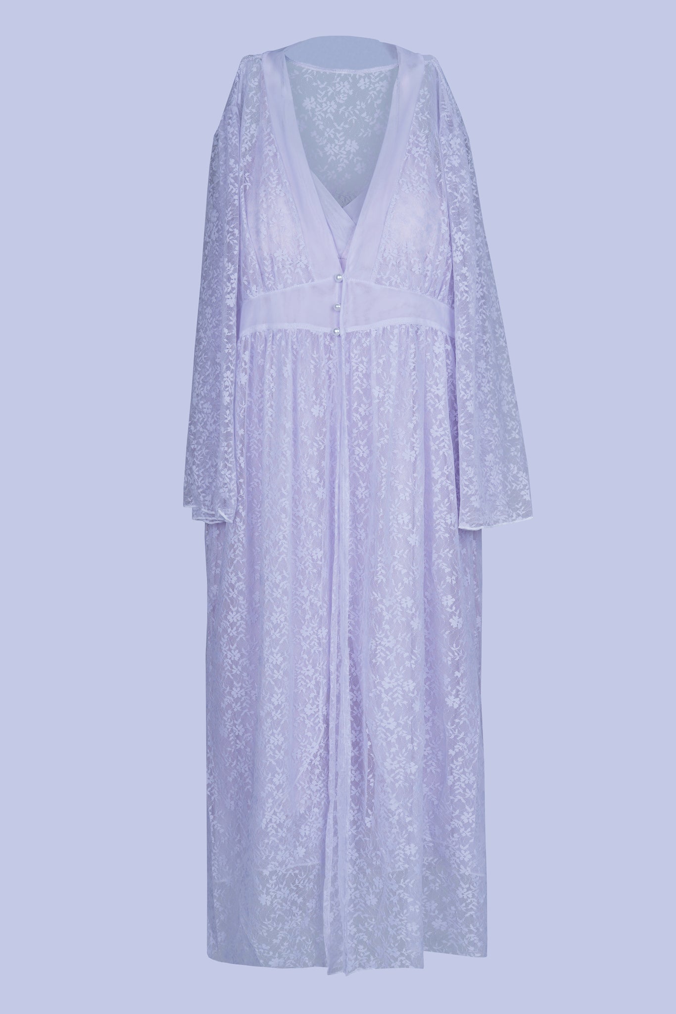 The Savvyy two-piece nightwear set is designed for women who love to combine comfort with timeless elegance. This set includes a flowing robe with delicate lace trims along the neckline and sleeves, paired with a matching slip that sits softly against the skin. The robe features a tie-up belt, allowing you to adjust the fit while adding an extra touch of grace.