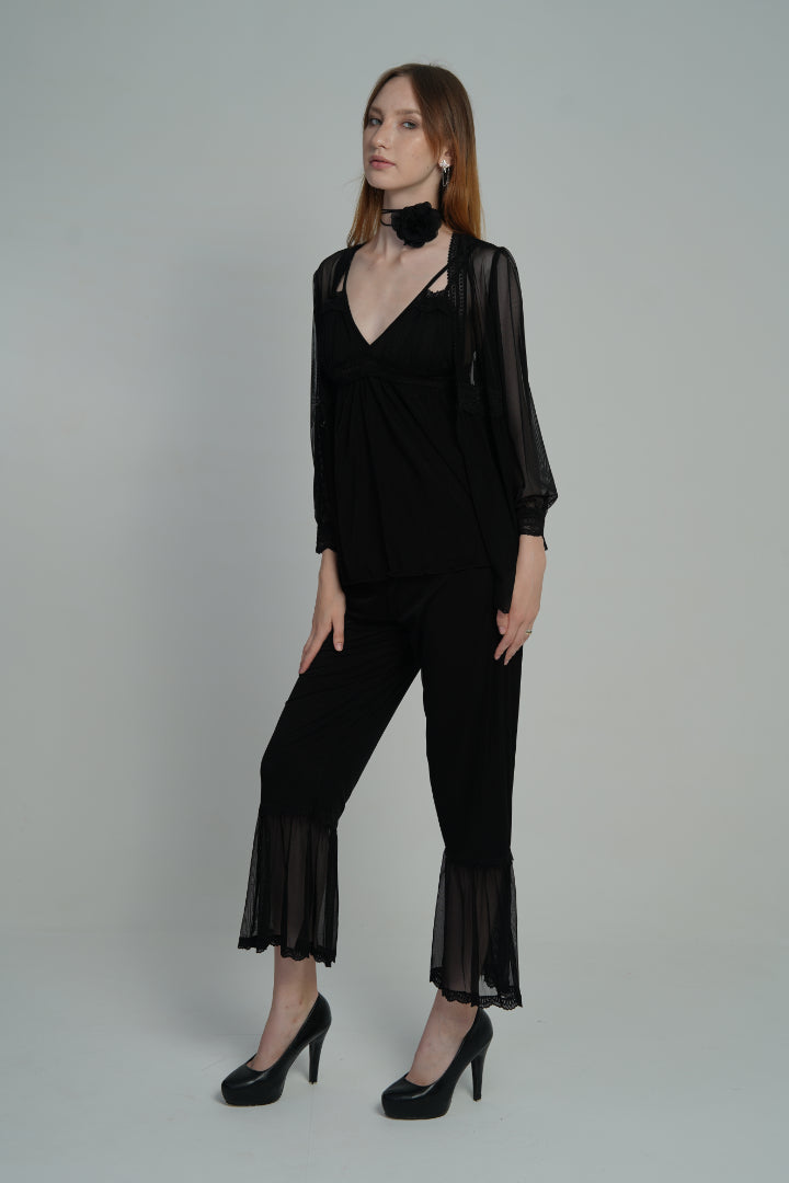 Designed for unforgettable nights, this three-piece bridal nightwear set combines sensuality with sophistication. The delicate layering of sheer fabric creates a captivating silhouette, while the soft flow of the design flatters every movement. The top features a plunging neckline with graceful sleeves that balance allure and elegance, while the matching trousers bring a playful twist with sheer flared hems that add drama to every step.