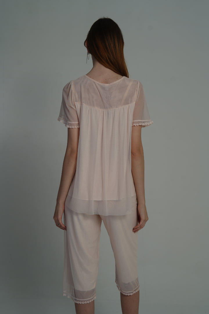Easy, airy, and effortlessly feminine—this 2-piece nightwear set is all about relaxed evenings and cozy nights. The sheer layered top features lace trim detailing with a satin bow tie, while the matching calf-length bottoms are designed with a loose fit for all-night comfort. Lightweight and breathable, it’s the kind of nightwear that feels soft on the skin yet looks graceful enough to lounge in style.