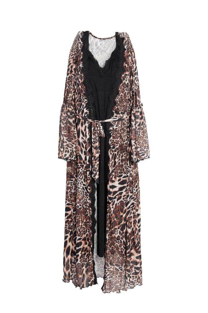 Two-Piece Set: Includes a fitted black slip dress and a flowy sheer leopard print robe.