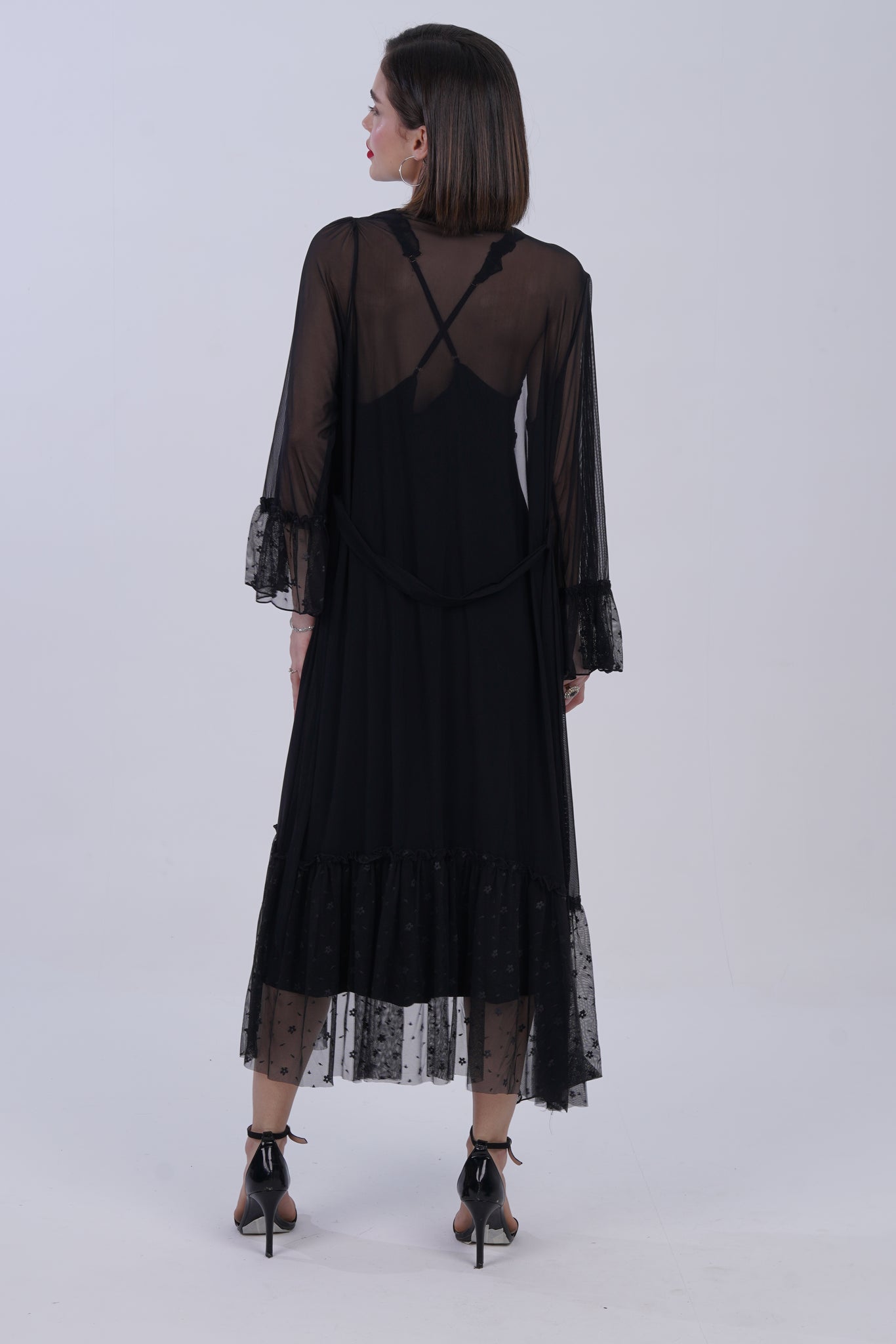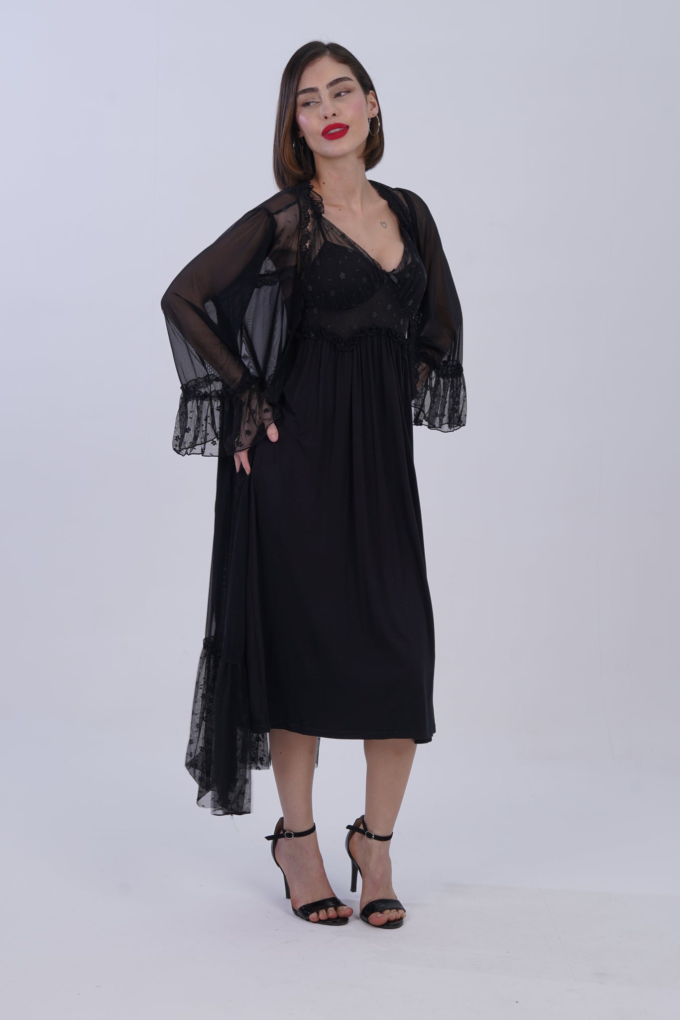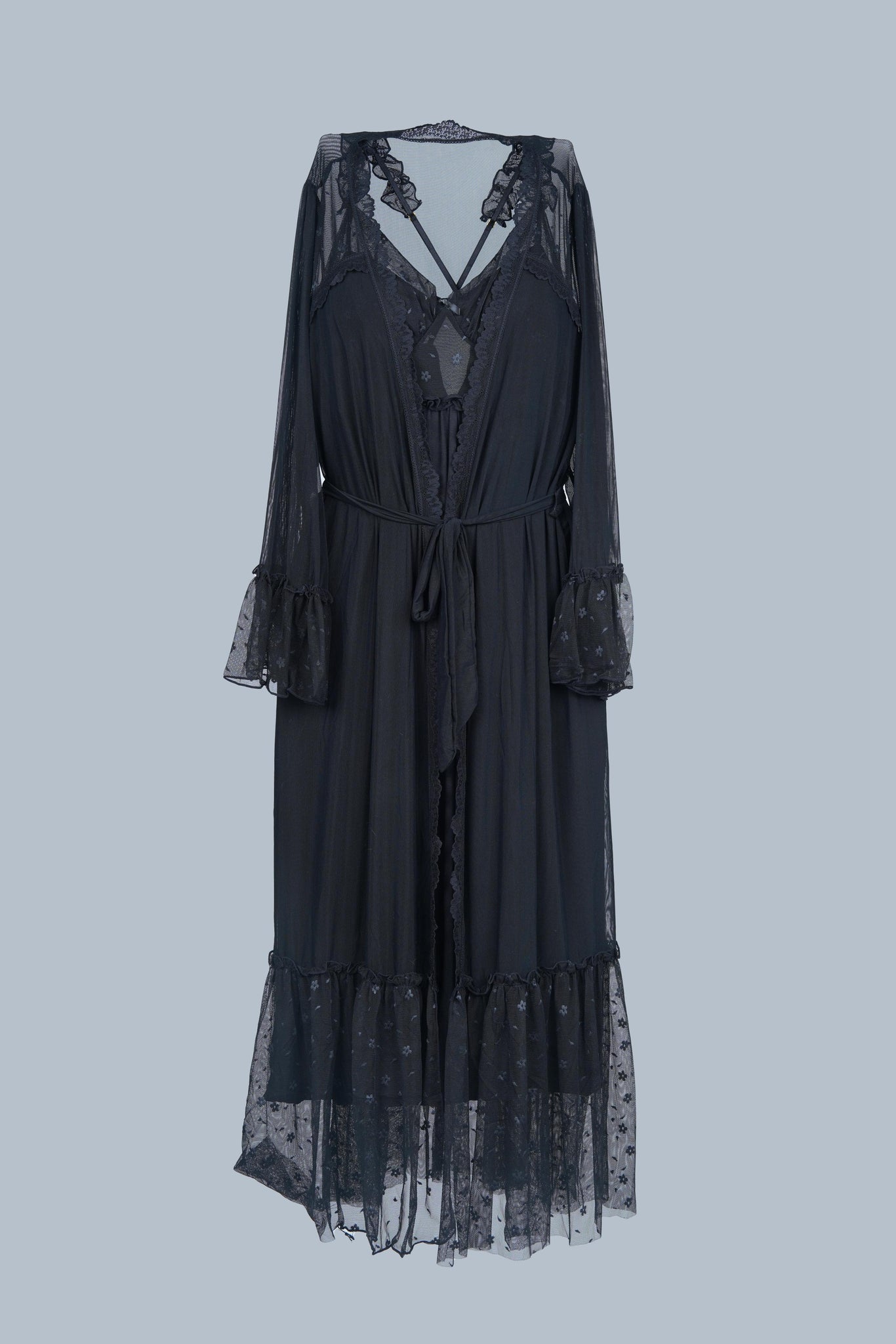 The waist-tie closure allows for adjustable styling, whether worn open for a more relaxed look or cinched at the waist to highlight curves. The full-length robe with sheer sleeves and flared edges gives the outfit a dramatic yet refined presence. This ensemble not only looks captivating but also feels luxurious against the skin, offering both comfort and sensuality.