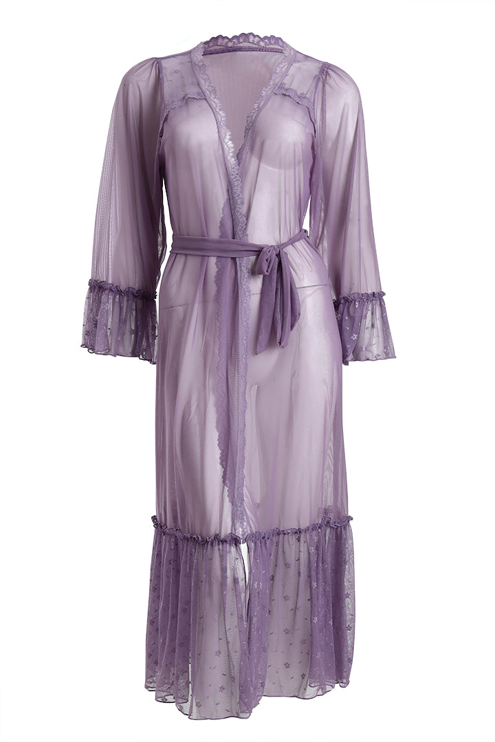 The waist-tie closure allows for adjustable styling, whether worn open for a more relaxed look or cinched at the waist to highlight curves. The full-length robe with sheer sleeves and flared edges gives the outfit a dramatic yet refined presence. This ensemble not only looks captivating but also feels luxurious against the skin, offering both comfort and sensuality.