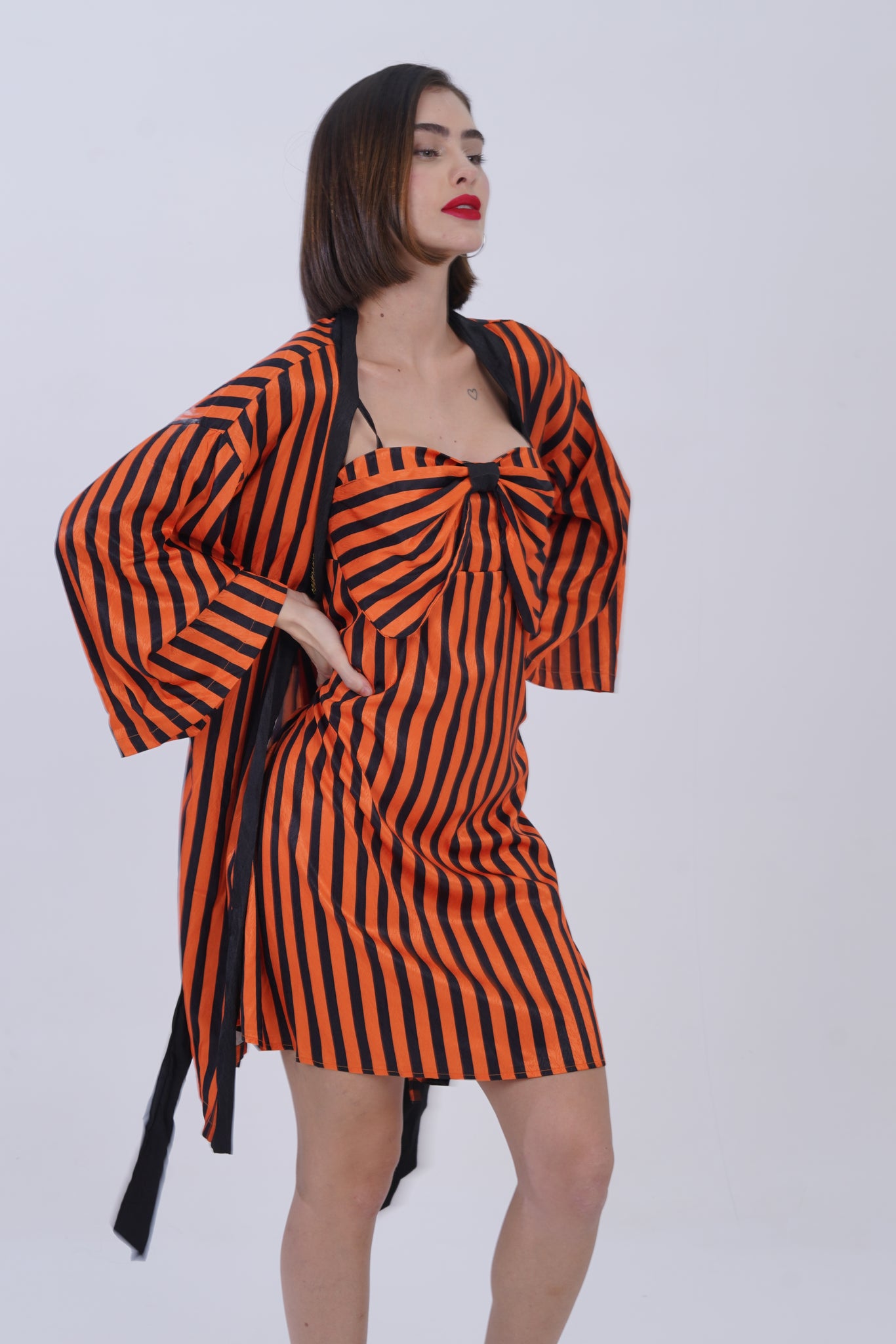 The robe, crafted with soft flowing fabric, drapes beautifully while offering full coverage when desired. The belted tie closure ensures a custom fit, making it versatile for lounging or layering. The strapless inner dress brings in a youthful charm, with a playful yet refined appeal that makes the set ideal for both relaxation and intimate moments.
