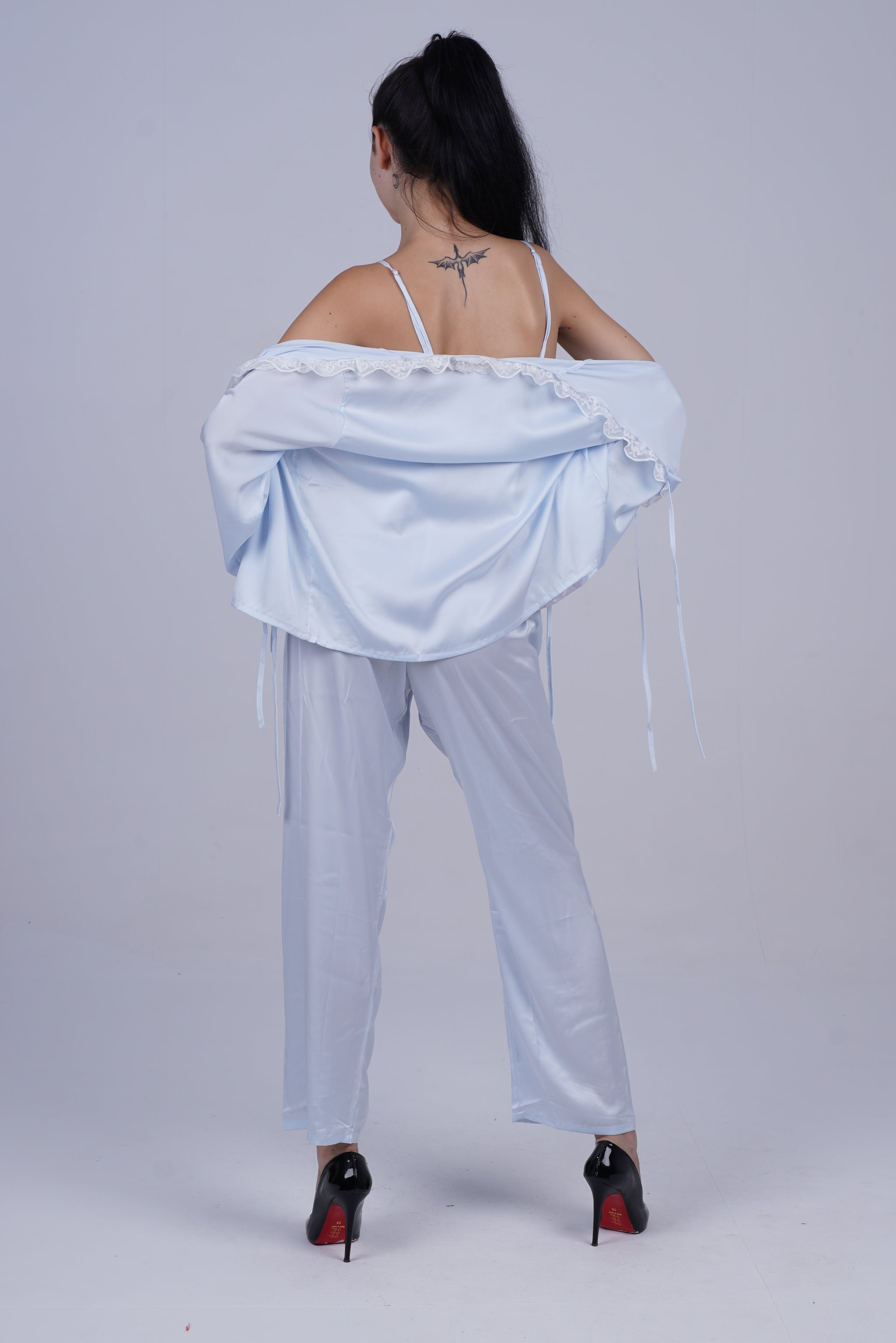 This three-piece nightwear set blends elegance with everyday versatility, offering a complete look designed for both style and comfort. The camisole features delicate lace accents at the neckline, paired with a soft, flowing cut that flatters while keeping the fit breathable and light. The matching trousers provide ease of movement with their relaxed fit and elastic waistband, creating a balance between sophistication and wearability.