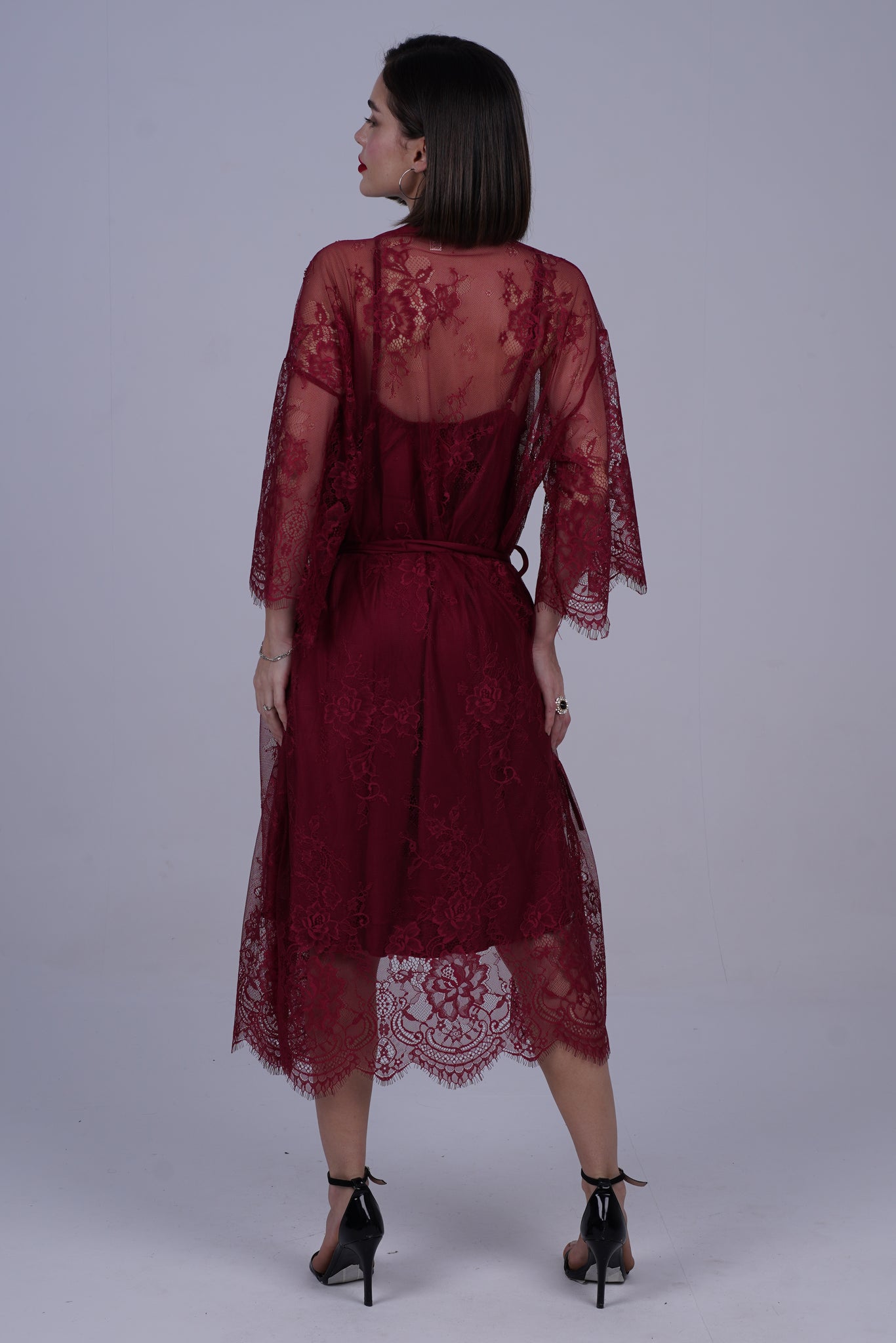 The flowing robe features delicate lace accents on the sleeves and waistline, creating a charming, romantic touch. Its tie-up belt cinches the waist beautifully, adding a flattering shape while allowing adjustable comfort. The inner slip complements the robe with a smooth, lightweight fit, ensuring you feel at ease while still looking effortlessly polished.