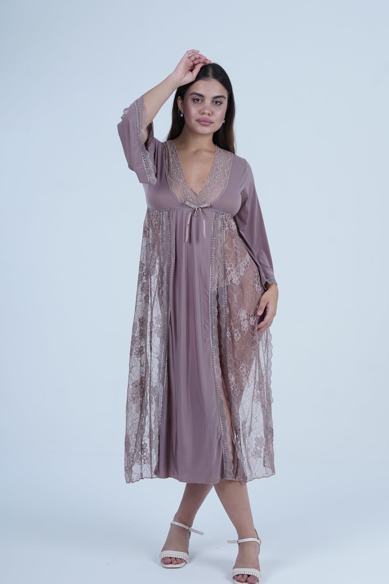 Savvyy introduces a two-piece nightwear set designed for women who love elegance with a sensual touch. This set includes a flowing sheer robe paired with a matching inner slip that beautifully complements the look. The robe features lace-trimmed edges and wide sleeves, giving it a graceful fall and a romantic appeal.