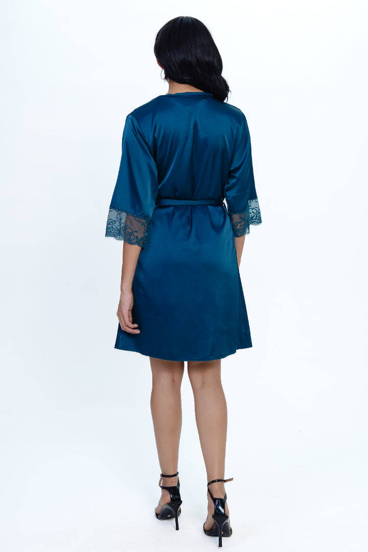 includes a soft satin robe, a delicate lace-trimmed slip, and a matching inner bralette that together create a graceful and flattering silhouette. The robe drapes effortlessly over the body, secured with a tie belt that cinches at the waist for a feminine finish. Sheer lace accents at the neckline and sleeves add a touch of sophistication, making it as stylish as it is comfortable.