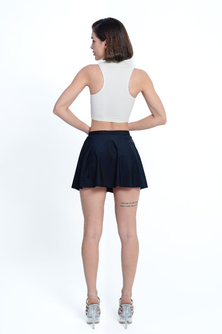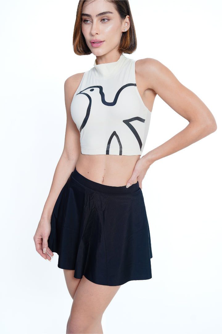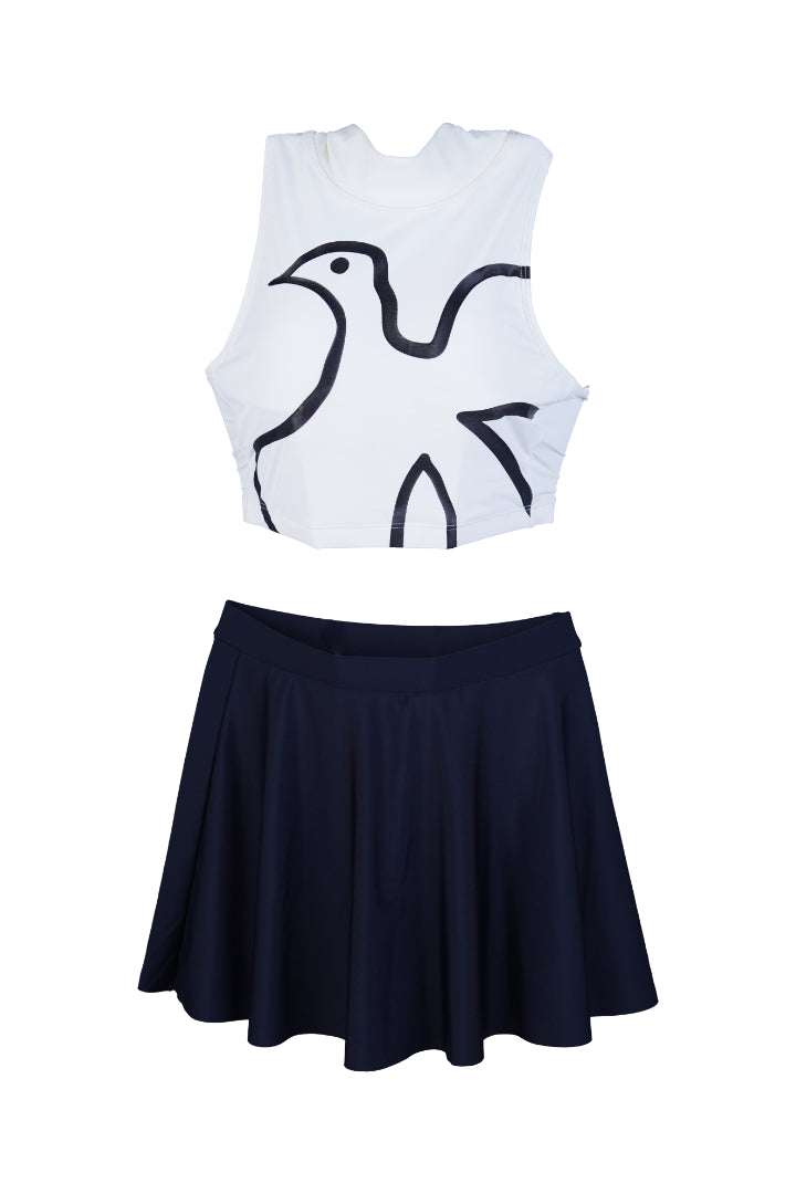 This two-piece swimwear set blends a confident silhouette with modern detailing. The top features a high neckline and bold abstract lines that draw attention without trying too hard. It offers a snug, supportive fit that keeps things in place while letting you move freely. The bottom is a classic A-line skirt — playful, flattering, and easy to wear all day. Whether you're lounging by the pool or heading to a beachside café, this set brings ease and personality to your swim look.