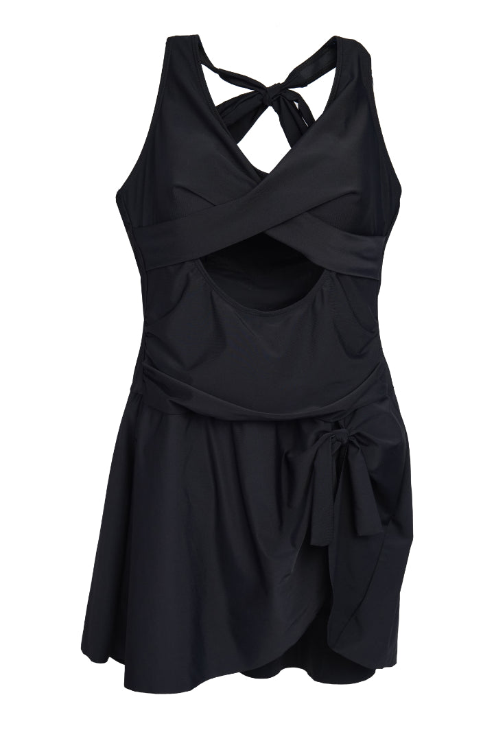 This one-piece swimsuit is all about sleek style with a confident twist. The top features a halter neckline with a front twist that gives just the right amount of edge. A subtle cutout at the midsection adds shape and a touch of drama, while the attached wrap-style skirt brings movement and coverage without feeling heavy. It’s designed to fit close to the body, sculpting your frame without restricting you. Whether you're poolside or planning a beach dinner look, this piece transitions easily from swim to statement.