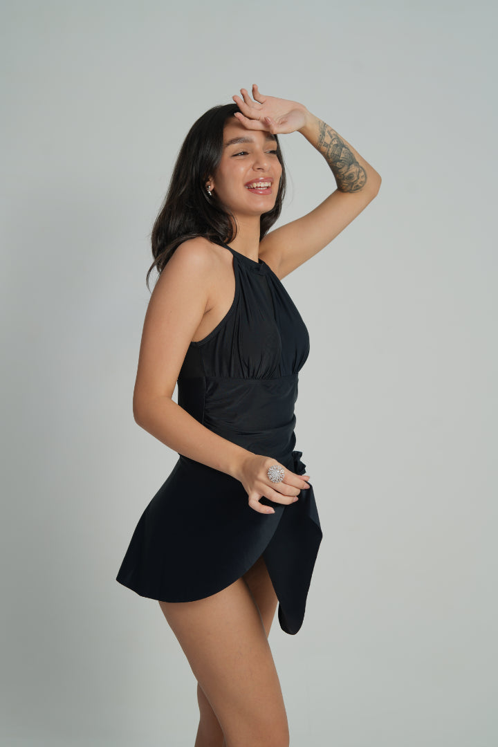 The skirted overlay creates graceful movement and adds coverage without compromising style, tied neatly with a side knot for a feminine finish. Crafted from quick-drying, stretchable fabric, it ensures ease of wear in and out of the water. Perfect for poolside lounging, beach strolls, or a swim under the sun, this piece delivers sophistication and allure in equal measure.