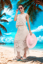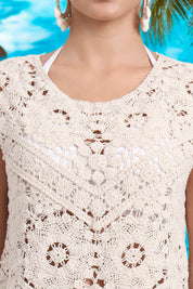 This one’s a beach must-have. It’s made from soft cotton crochet that feels light and airy—perfect for warm days. The pattern is beautifully done, with a mix of floral and netted designs that give it that relaxed, boho feel. The tassels at the hem add just the right touch of movement when you walk.