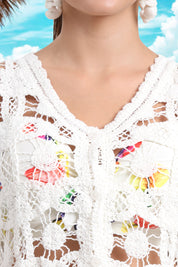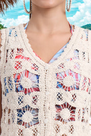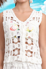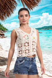 The pattern is a delicate mix of open floral loops and bold stitches, letting just the right amount of skin peek through. It features a flattering V-neckline and dainty front buttons that add an extra touch of detail. The hemline has a gentle curve, giving it a slightly cropped look without feeling too short. You’ll love how it softly hugs the waist while still keeping things relaxed and easygoing.