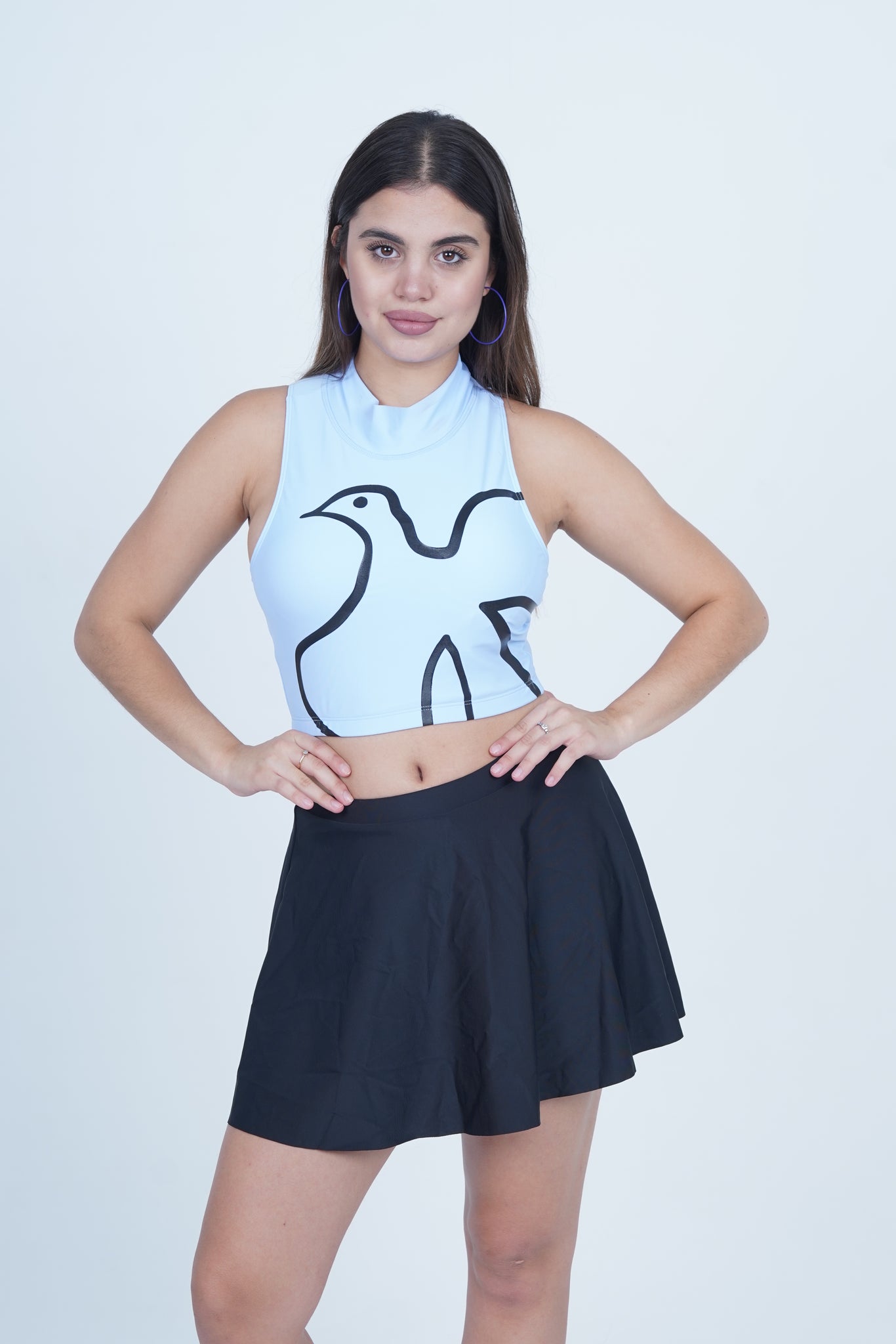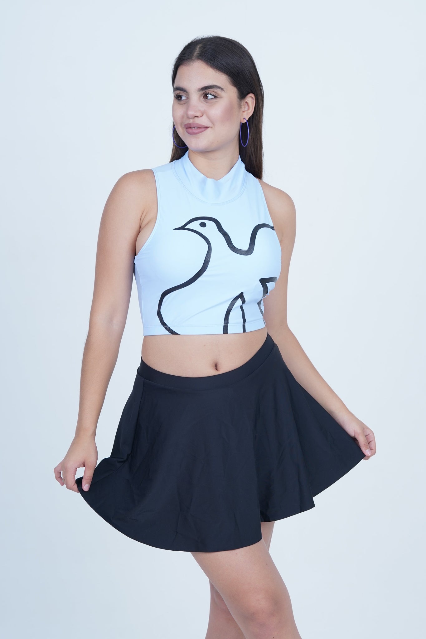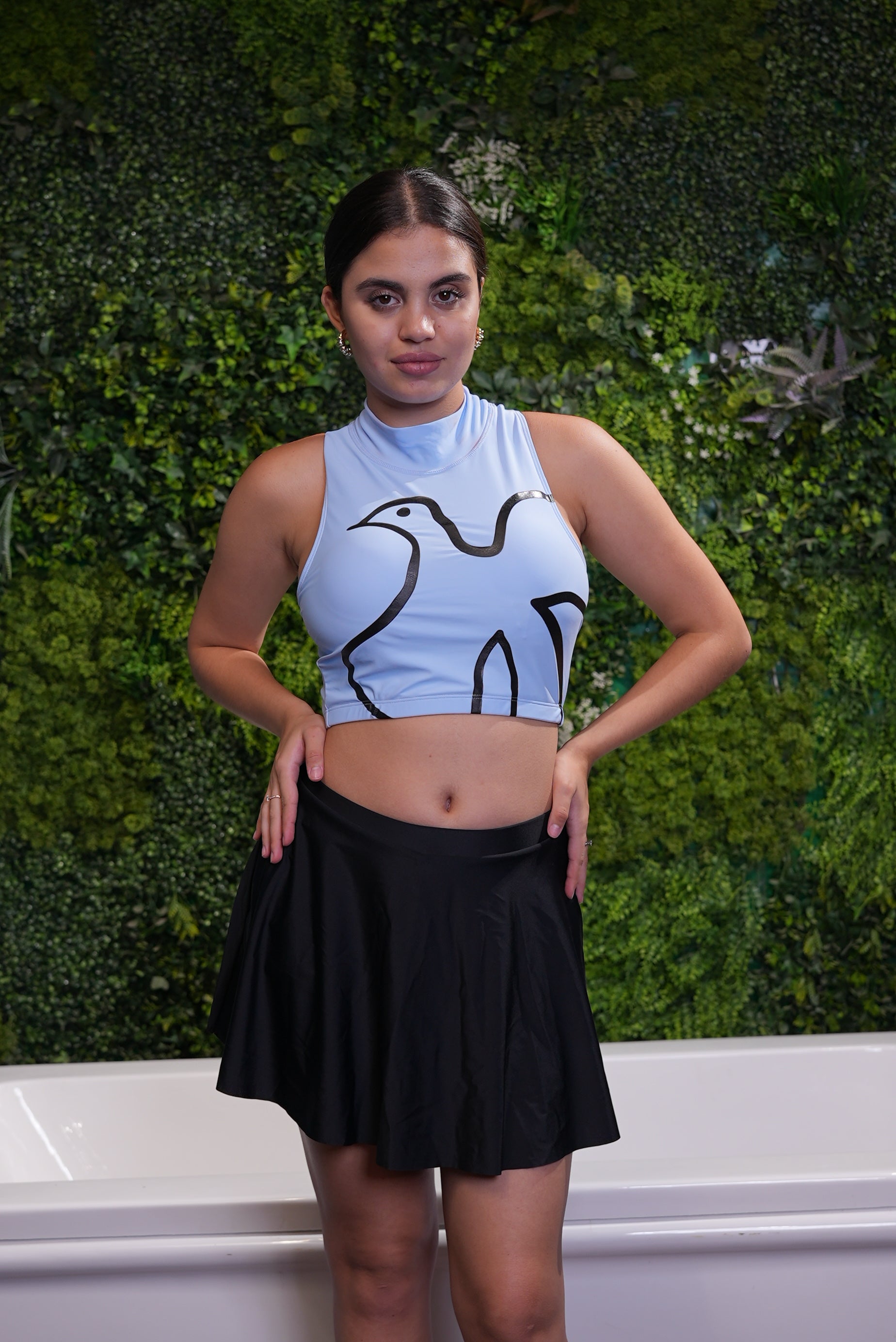 This two-piece swimwear set blends a confident silhouette with modern detailing. The top features a high neckline and bold abstract lines that draw attention without trying too hard. It offers a snug, supportive fit that keeps things in place while letting you move freely. The bottom is a classic A-line skirt — playful, flattering, and easy to wear all day. Whether you're lounging by the pool or heading to a beachside café, this set brings ease and personality to your swim look.