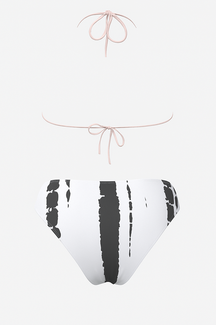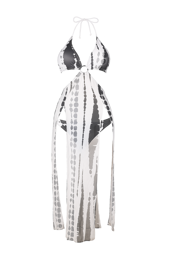 This 3-piece beachwear set features a halter-style bikini top, coordinating bottoms, and a flowing mesh cover-up. The ring detail at the front adds a stylish touch, while the sheer outer layer offers light coverage without compromising on style. Ideal for beach lounging or a resort escape, this set balances comfort, flair, and versatility.