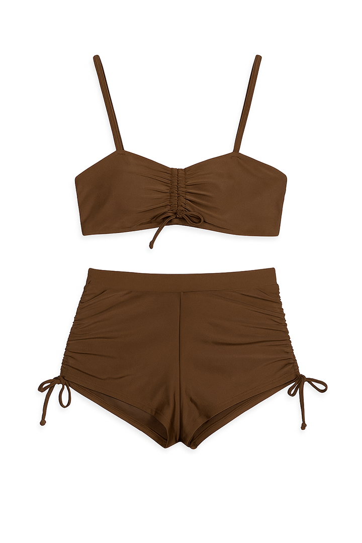 Designed for comfort and style, this 2-piece swimsuit features a ruched bandeau-style top with adjustable drawstrings and matching high-waisted shorts. The shorts include side ties and gentle ruching for a flattering silhouette, perfect for full coverage without compromising on trend.