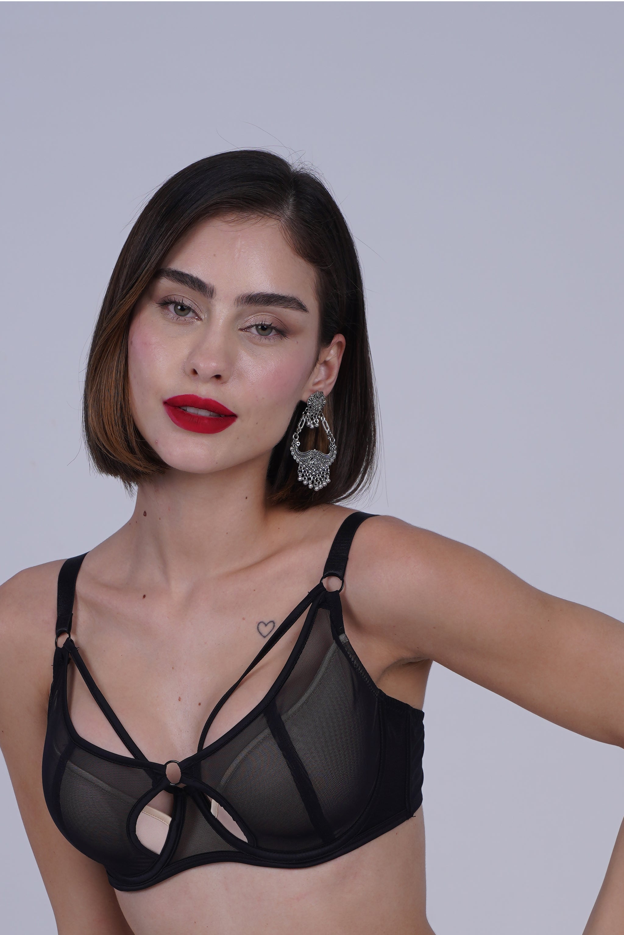 This exquisite one-piece bra paired with a matching panty is crafted for women who love the perfect balance of elegance, comfort, and bold style. The bra features a unique sheer mesh design complemented by delicate strappy detailing, creating a modern and sensual silhouette that enhances your natural shape. The soft underwired cups offer gentle lift and support, while the adjustable straps ensure a personalized fit that feels as good as it looks.
