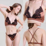Add a touch of luxury to your lingerie collection with the Brown Satin Bralette Set. This stunning bralette, crafted from rich satin fabric, features adjustable straps for a perfect fit and elegant lace detailing for a sophisticated finish. The matching brown thong complements the bralette, creating a cohesive and chic look. Ethically made in our atelier and finished with Mysthelle’s signature gold hardware, this set is perfect for those seeking both comfort and style.