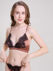 Deep V-neck brown satin bralette with adjustable straps for a custom fit