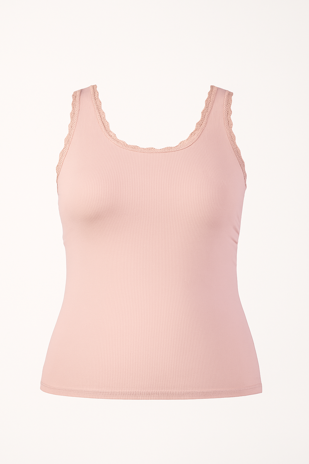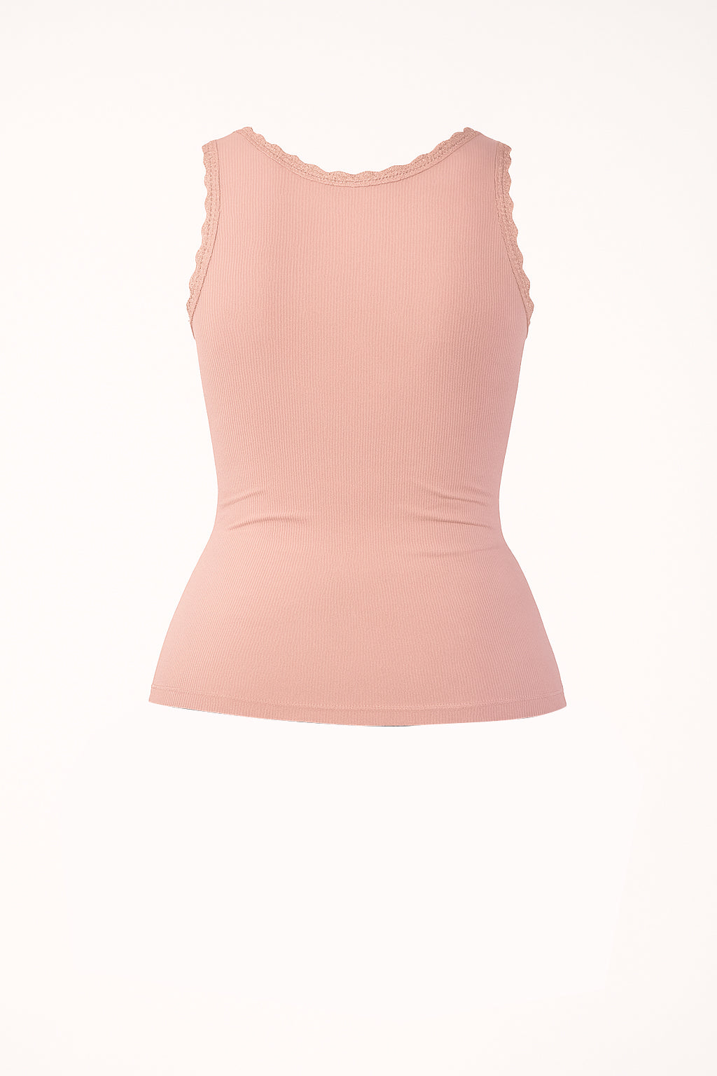 This ribbed camisole is your ride-or-die layer — soft, stretchy, and made to move with you. The wide neckline gives just enough shape without digging in, and the subtle lace trim adds a low-key feminine vibe without trying too hard.