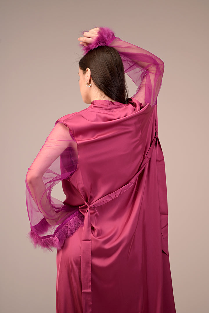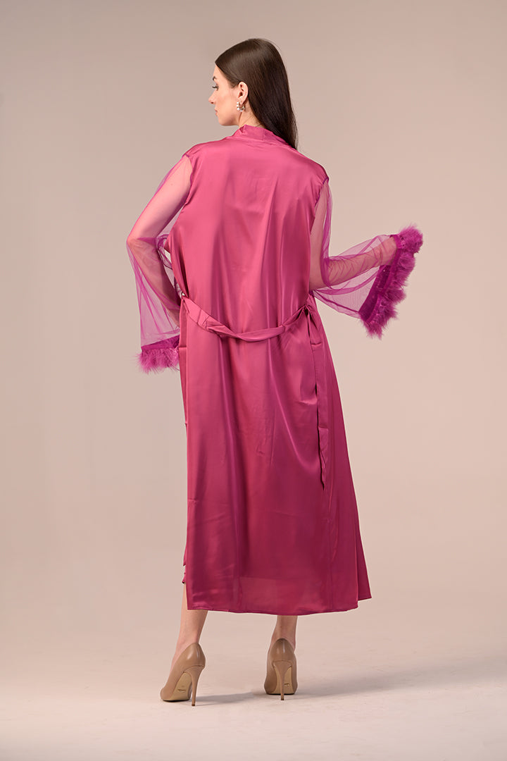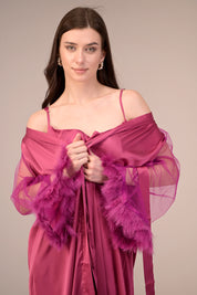 The matching robe elevates the look with net full sleeves, beautifully adorned with soft, feminine features at the cuffs, creating a sensual, sophisticated finish. This set exudes romance, perfect for intimate evenings where you want to feel both alluring and graceful.